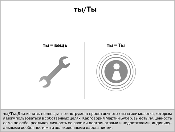 Я призываю вас серьезно отнестись к этой парадигме и в личной жизни действовать согласно ей. Вспомните одного-двух человек – это могут быть коллеги, друзья, члены семьи, – которых должны будете увидеть. Вы поняли, что я имею в виду. Есть ли у них основания считать, что вы их недооцениваете, игнорируете, имитируете уважение к ним? Вы обсуждаете их у них за спиной? Они для вас символы или реальные люди со своими достоинствами и недостатками, характерными особенностями и противоречиями, удивительными дарованиями и непознанными «белыми пятнами» – такие же, как и вы?