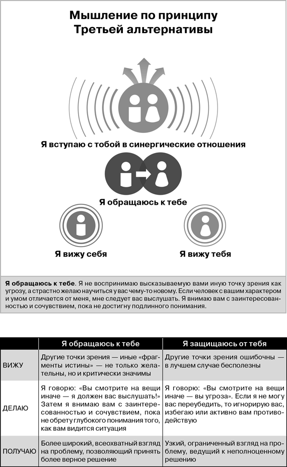 Я называю эту парадигму «я обращаюсь к тебе», чтобы выразить тот глубокий сдвиг мышления, без которого Третья альтернатива недостижима. Сталкиваясь с кем-то, кто со мной не согласен, я, как любой другой человек, автоматически занимаю оборонительную позицию. Именно поэтому Третья альтернатива противоречит всякой очевидности. Она побуждает меня высоко ценить людей, отличающихся от меня, а не отгораживаться от них крепостными стенами.