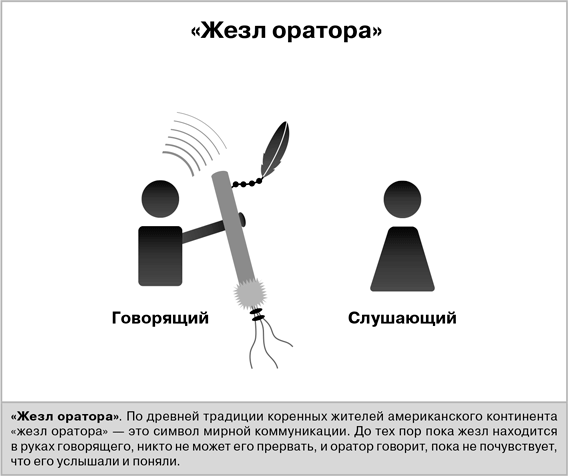 Много столетий коренные жители Америки использовали на своих племенных советах такой жезл, демонстрирующий, кто имеет право держать речь. Пока он находится в руках говорящего, пока оратор не убежден, что его выслушали и поняли, никто не смеет его прервать. Однажды очень уважаемая группа лидеров коренных американцев наградила меня традиционным «жезлом оратора», которым я очень дорожу. (На той же церемонии они дали мне имя «Белоголовый орлан»!)