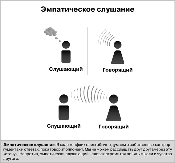 Эмпатия отличается от симпатии, которая заключается в том, чтобы соглашаться с кем-то или занимать его сторону в конфликте. Эмпатически слушать не значит соглашаться с точкой зрения другого человека. Это значит пытаться понять его взгляды. Это значит прислушиваться как к содержанию высказывания, так и к эмоциям, которые выражает другой человек, что дает нам способность влезть в его шкуру и на собственном опыте испытать, что он чувствует.