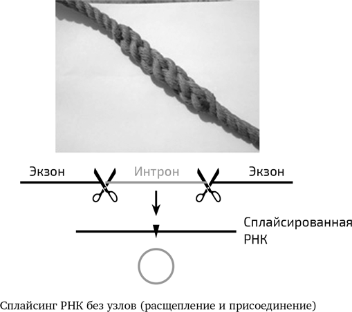 Во время плавания по Балтийскому морю на трехмачтовом круизном судне «Лили Марлен» однажды утром меня удивил один матрос, сделав подарок: сращенную веревку. Он соединил две веревки, срастив их концы (в биологии используется слово «сплайсинг»), – получилось наглядное пособие для студентов, которым я читаю лекции по вирусологии. По словам матроса, для сращивания требуются определенные навыки, но это занятие скрашивало утомительные ночные вахты. В книге «Сплесень и узлы» описывается, как это используется в мореходстве. Хорошо было бы иметь книгу с таким же названием в молекулярной биологии. Сращивание – это своего рода противоположность узлу. Только когда концы веревки правильно сращены, моряк может быстро и беспрепятственно проверить все связанные части, протянуть веревки через шкивы и поднять паруса; при наличии узлов этого не удалось бы сделать. Такой же принцип работает и для молекулярного мира. Двухцепочечная ДНК транскрибируется в одноцепочечную РНК – гибкую копию ДНК, имеющую жесткую структуру. РНК можно укорачивать, как веревку, путем сплайсинга: веревка разрезается, какой-нибудь кусочек удаляется, а полученные концы соединяются без использования узлов путем сращивания. Длина удаленных кусочков может быть разной. А сейчас я открою один секрет: у человека самое большое число таких удаляемых участков из расчета на один ген. Именно поэтому мы самые сложноорганизованные живые существа. В этом заключается наша уникальность; возможно, мы действительно являемся «венцом творения».