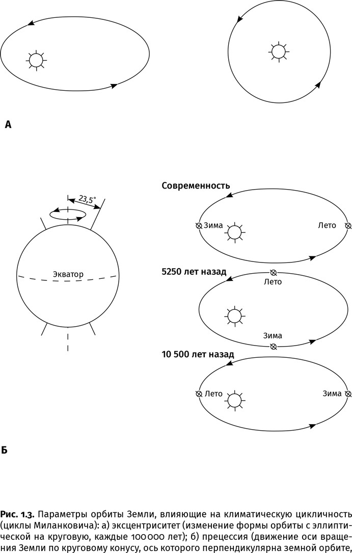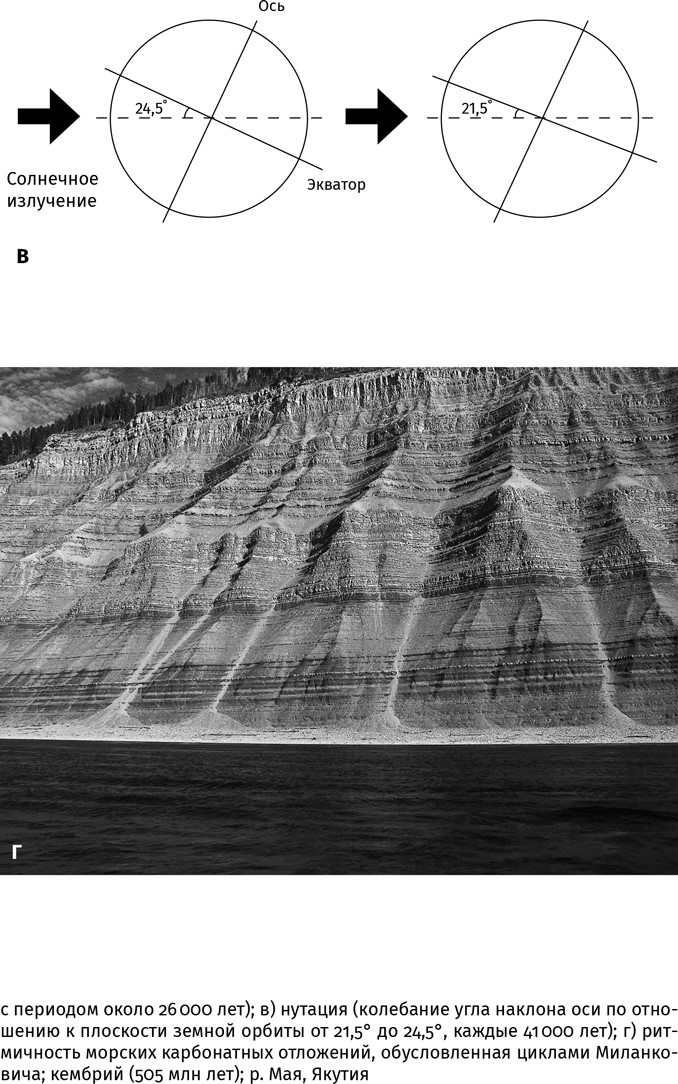 Когда же требуется узнать время, за которое сформировалась та или иная толща осадков, прибегают к варвохронологии или циклостратиграфии. Последний метод основан на выявлении повторяющихся ритмов в осадочных отложениях, связанных с периодичностью климатических колебаний. Связь такой периодичности с орбитальными циклами в Солнечной системе, где взаимное притяжение планет и крупных спутников искажает правильность орбит, предначертанную законами Кеплера – Ньютона, установил югославский физик Милутин Миланкович. Эти орбитальные циклы включают прецессию (примерно каждые 26 000 лет земная ось описывает коническую фигуру), нутацию (каждые 41 000 лет колеблется угол наклона оси к плоскости земной орбиты) и эксцентриситет – изменение формы орбиты с эллиптической на круговую и обратно, но в плоскости, перпендикулярной прежней, и снова на круговую каждые 400 000 лет (полный цикл) (рис. 1.3а – г).