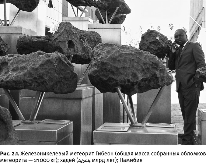 Еще более действенны процессы, связанные с тектоникой плит, – субдукция и гранитный метаморфизм в зоне коллизии. Ведь и сами материки вместе с шельфами не всегда были такими, как сейчас. Осталось ли вообще что-нибудь от древнейших отложений? Да, осталось. Хотя при возрасте Земли 4,567 млрд лет от ее горных пород возрастом свыше 4,03 млрд лет не сохранилось ничего, кроме жалких крох: переотложенных в более молодых осадках обломков кристаллов циркона (ZrSiO4) – одного из самых устойчивых минералов – возрастом 4,2 и 4,4 млрд лет на кратоне Йилгарн (Западная Австралия). И даже эти крохи способны кое-что прояснить благодаря захваченным ими в момент кристаллизации частицам других минералов: например, наличие у планеты той поры земной коры, жидкой водной оболочки, где кристаллы сформировались, и магнитосферы. Данные о древнейшей водной оболочке особенно ценны, поскольку от нее не уцелело больше ничего: она полностью испарилась и развеялась в космосе во время мощных метеоритных бомбардировок, которым планеты земной группы подверглись 4,0–3,8 млрд лет назад. К этому интервалу приурочено большинство лунных и марсианских кратеров; земные же поглощены тектоническими процессами. (Появились сведения об обнаружении в зеленокаменном поясе Нуввуагиттук на Канадском щите – на северо-западе полуострова Лабрадор – связанных с гидротермами морских отложений возрастом 3,77–4,28 млрд лет и даже о следах бактериальной жизнедеятельности в них. Однако эти находки и их датировка требуют дальнейшего всестороннего изучения.) В результате всевозможных и непрекращающихся преобразований земных слоев 80 % из них имеет возраст менее 200 млн лет, а вот на Луне, где процесс тектоники плит не пошел, те же 80 % представлены горными породами древнее 4 млрд лет. Поэтому, чтобы заглянуть глубже, придется слетать на Луну и привезти образцы оттуда, благо это уже сделали в 1960–1970-е гг. бесстрашные американские астронавты и хитроумные советские спускаемые аппараты: возраст древнейших лунных пород оказался 4,417 млрд лет (отдельных кристаллов – до 4,51 млрд лет). Некоторые включения минералов в метеоритах, найденных на Земле, но представляющих собой остатки протопланетного вещества, могут быть и постарше нашей планеты – до 4,568 млрд лет (время образования Солнечной системы) (рис. 2.1). Утерянная глава каменной летописи Земли – 4,568–4,0 млрд лет – называется хадейским эоном (от греч. γάϊος – подземный мир).