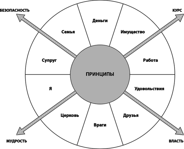 То, что находится в центре жизни человека, неизбежно становится его системой жизнеобеспечения. Эту систему можно представить четырьмя фундаментальными измерениями, или координатными осями: безопасность, курс, мудрость и власть. Принцип-центричность в лидерстве и жизни развивает эти четыре внутренних источника силы.
