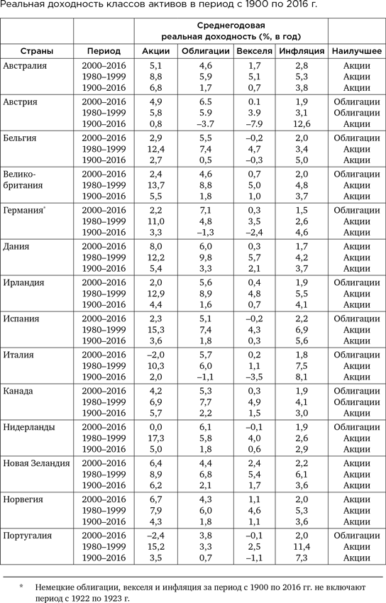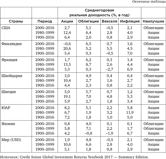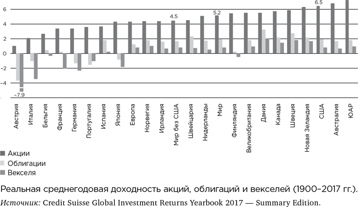 Сначала вернемся от этих цифр к менее впечатляющему рабочему виду: годовой реальной доходности. В целом по миру у акций – 5 %, у облигаций – 2 %, у векселей – 1 %.