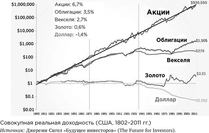 График дает понять, что доллар, вложенный в акции в 1802 году, превратился бы сейчас в миллион долларов! И это с учетом инфляции, то есть шесть нулей – это реальная, а не номинальная доходность. Как можно смотреть на это и отрицать?