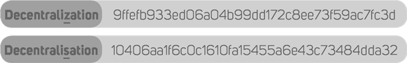 Начнем с определения. Хеширование – это метод преобразования набора данных произвольного размера в стандартизированную строку фиксированной длины при помощи специального алгоритма. То есть если взять какой-то набор данных, например, весь текст этой книги, то можно создать его цифровой отпечаток длиной, скажем, десять символов. При этом мы должны определить точный алгоритм преобразования входных данных и использовать его без изменения для любых других данных произвольного размера, получая на выходе стандартную строку в десять символов. Еще говорят, что в таком случае используется «детерминированный алгоритм», потому что он всегда выдает предопределенный результат. Фактически получаемый результат должен стать уникальным отображением преобразуемых входных данных. Для этого мы должны создать такой алгоритм преобразования, который ни при каких обстоятельствах не допустит получения одинакового результата преобразования для разных входящих наборов данных. То есть не создаст так называемых «коллизий». При этом малейшее изменение во входных данных, даже изменение одного их бита, должно видоизменять результирующий хеш на выходе до неузнаваемости. Вот пример работы одного из самых простых алгоритмов хеширования (SHA-1), где прообразами хешей являются два варианта написания английского слова «децентрализация», при этом во втором слове изменена всего лишь одна буква: