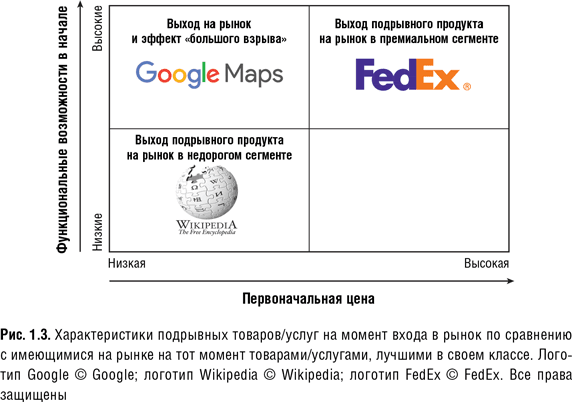 Модель Кристенсена в ее первоначальном виде и примеры компаний, приведенные на рис. 1.3, отражают одни и те же два параметра, но в разных комбинациях и, соответственно, описывают две полярно различные точки входа в рынок: высокая функциональность и соответствующая цена либо ограниченная функциональность и низкая цена. Обычно требуются годы, чтобы какое-то подрывное событие в ходе развития рынка полностью трансформировало соответствующую отрасль.