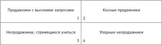 Есть четыре основных типа продажников: продажники с серьезными запросами, стремящиеся развивать и оттачивать свои умения; продажники загнанные, зашоренные, циничные и косные; непродажники, понявшие, что им нужно уметь продавать – врачи, владельцы автомастерских, чистильщики ковров и пр.; непродажники, еще не понявшие этого или сопротивляющиеся этой мысли.