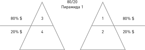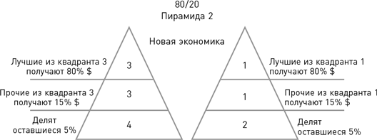 В Новой экономике 95 % денег стекаются в первый и третий квадрант, где делятся и распределяются непропорционально самыми целеустремленными продажниками и самыми заинтересованными непродажниками. Сегодня обязательно быть умнее, проницательнее, прогрессивнее, агрессивнее, организованнее, и во всех отношениях «-ее» других, чтобы выбраться на вершину пирамиды, которая выглядит вот так.
