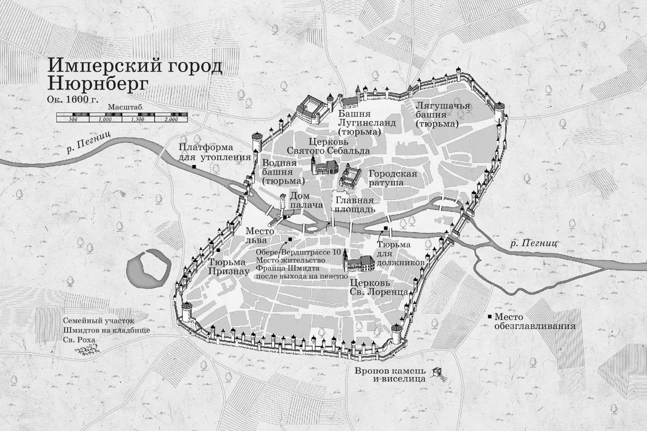 ЮЛИЙ КРАУТЦ, БЕРЛИНСКИЙ ПАЛАЧ (1889 Г.)[1]Солнце едва взошло над горизонтом, когда горожане уже начали собираться прохладным утром четверга 13 ноября 1617 года. Имперский город Нюрнберг, известный на всю Европу как цитадель закона и порядка, готовился к очередной публичной казни, и зрители из разных слоев общества спешили занять хорошие места до начала действа. Торговцы уже выставили свои лотки с нюрнбергскими колбасками, квашеной капустой и соленой сельдью, расположившись вдоль всего маршрута шествия на казнь, от ратуши до виселицы прямо за городскими воротами. В толпе звенели бутылками разносчики вина и пива, среди которых были и совсем дети. Примерно к десяти утра собралось несколько тысяч горожан, и дюжине или около того городских стражников, известных в народе как стрелки, уже с трудом удавалось поддерживать порядок. Пьяная молодежь толкалась и горячилась, распевая непристойные куплеты. Острый запах мочи и рвоты смешивался с ароматом жареных сосисок и каштанов.