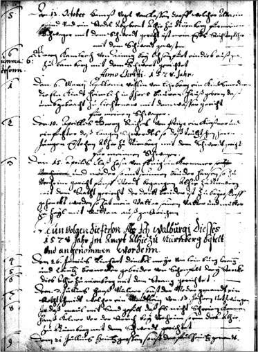 Страница копии дневника Франца Шмидта 1634 года, самой старой из сохранившихся версий, которая находится в Городской библиотеке Нюрнберга. Нумерация казней в левом поле, вероятно, была добавлена переписчиком