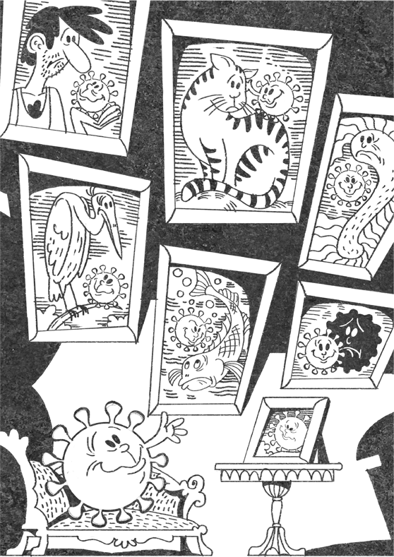 Доказательство фантастической успешности вирусов – их зашкаливающее количество. И хотя точно подсчитать, сколько именно вирусов на планете, невозможно, согласно некоторым прикидочным оценкам{2}, только в океане примерно четыре нониллиона вирусов. Нониллион – это единица с 30 нулями. Представить настолько гигантское число очень трудно, но, например, наше Солнце весит два нониллиона килограммов. Обитают вирусы, разумеется, не сами по себе, а внутри живых организмов: на планете нет существ, которые не были бы освоены вирусами. Звери, птицы, растения, грибы, бактерии – и даже сами вирусы: у всех них есть множество собственных вирусов, вызывающих всевозможные патологии. Некоторые вирусы строго специфичны и поражают только один вид, другие не столь разборчивы и могут перескакивать с хозяина на хозяина, приводя к появлению новых болезней. Именно так произошло с SARS-CoV-2.