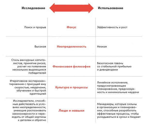 Непобедимые компании не ставят использование выше исследования. Они добились блестящих успехов в одновременном управлении всем континуумом: от исследования новых видов деятельности до осуществления имеющихся. Они поддерживают культуру «первого дня», сохраняя дух стартапа, и при этом управляют тысячами и даже сотнями тысяч людей и многомиллиардными бизнесами. Умение управлять исследованием и использованием свойственно не только крупным известным компаниям. Учитывая сокращение срока службы бизнес-моделей в различных областях, это вопрос выживания для малых и средних компаний и стартапов.