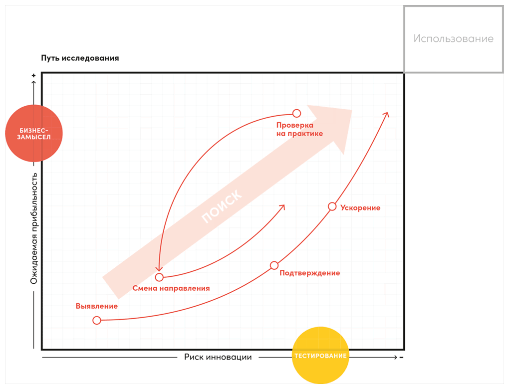 Исследовательский портфель полностью посвящен поиску новых идей, ценностных предложений и бизнес-моделей, обеспечивающих будущее компании. Поиск нацелен на максимизацию ожидаемой прибыльности и минимизацию риска инновации. Ожидаемую прибыльность повышают путем улучшения дизайна бизнес-модели. Риск принятия провальной идеи снижают путем ее тестирования и адаптации.