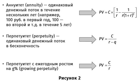 В результате перед шагом 4 вы получаете финансовую модель проекта. На практике финансовые модели проектов вы будете строить с помощью электронных таблиц, таких как Excel. Плюс к этой программе существует несколько упрощенных формул дисконтирования, которые заметно облегчают жизнь (рис. 2).