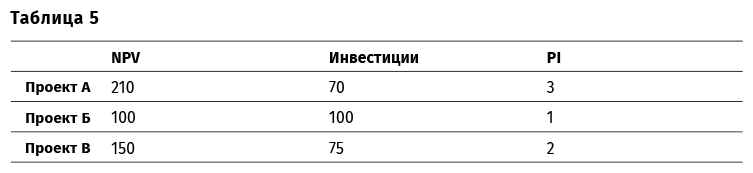 Предположим, что всего у вас есть 180 руб. на инвестиции. В этом случае вы вложите деньги только в проекты А и В, так как они обеспечивают наибольшую отдачу на рубль инвестиций.