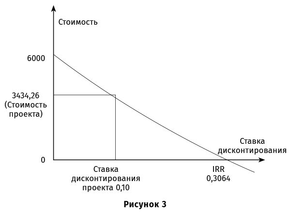 Обратите внимание, что, исходя из логики формулы дисконтирования, NPV проекта уменьшается по мере увеличения ставки дисконтирования (рис. 3).