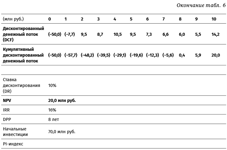 Если для оценки привлекательности проектов используется только этот метод, то из нескольких альтернативных проектов при прочих равных условиях принимается тот, который имеет меньшее значение DPP. Однако метод имеет недостаток – он не учитывает денежные потоки, которые могут быть получены после завершения периода окупаемости и могут повлиять на эффективность проекта (то есть абсолютное значение NPV).