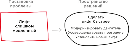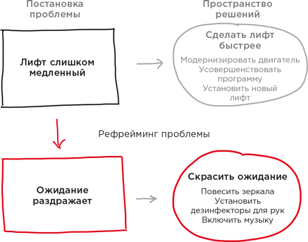 Многие из нас не обращают внимания на постановку проблемы: мы принимаем ее как данность и бросаемся искать решение. Мы начинаем придумывать идеи, как сделать лифт быстрее: попробовать увеличить мощность старого двигателя? усовершенствовать программу, управляющую движением лифта? установить новый лифт?