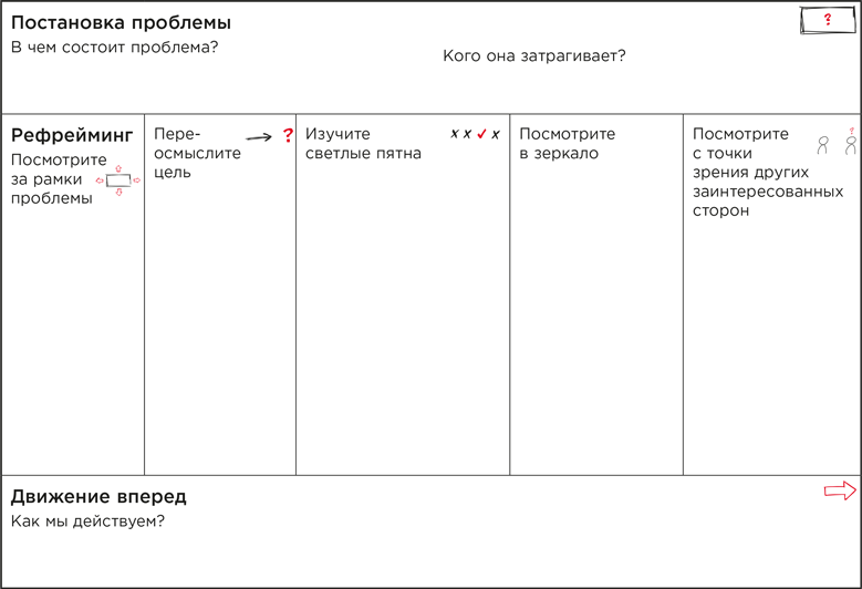 КАНВА РЕФРЕЙМИНГАНаконец, я познакомлю вас с визуальным инструментом под названием канва рефрейминга. Это шаблон с указанием ключевых шагов, который вы можете использовать самостоятельно или вместе со своей командой или клиентами для рефрейминга проблем. Эту и другие версии канвы можно бесплатно скачать на сайте книги.