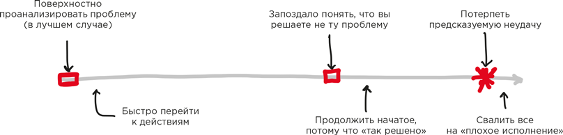 Большинство людей понимают опасность поспешного перехода к действиям. Но они не видят альтернативы в тех напряженных рабочих условиях, в которых им приходится решать проблемы. Конечно, у авторов вроде меня есть куча свободного времени, чтобы, неторопливо потягивая латте, предаваться тому, что подруга моей дочери называет «размыслительными мыслями» (это специализированный термин). У людей, занимающихся «настоящей» работой, как правило, нет такой роскоши. В условиях дефицита времени большинство предпочитают сразу же бросаться в атаку на проблему, надеясь затем внести корректировки, если что-то пойдет не так.