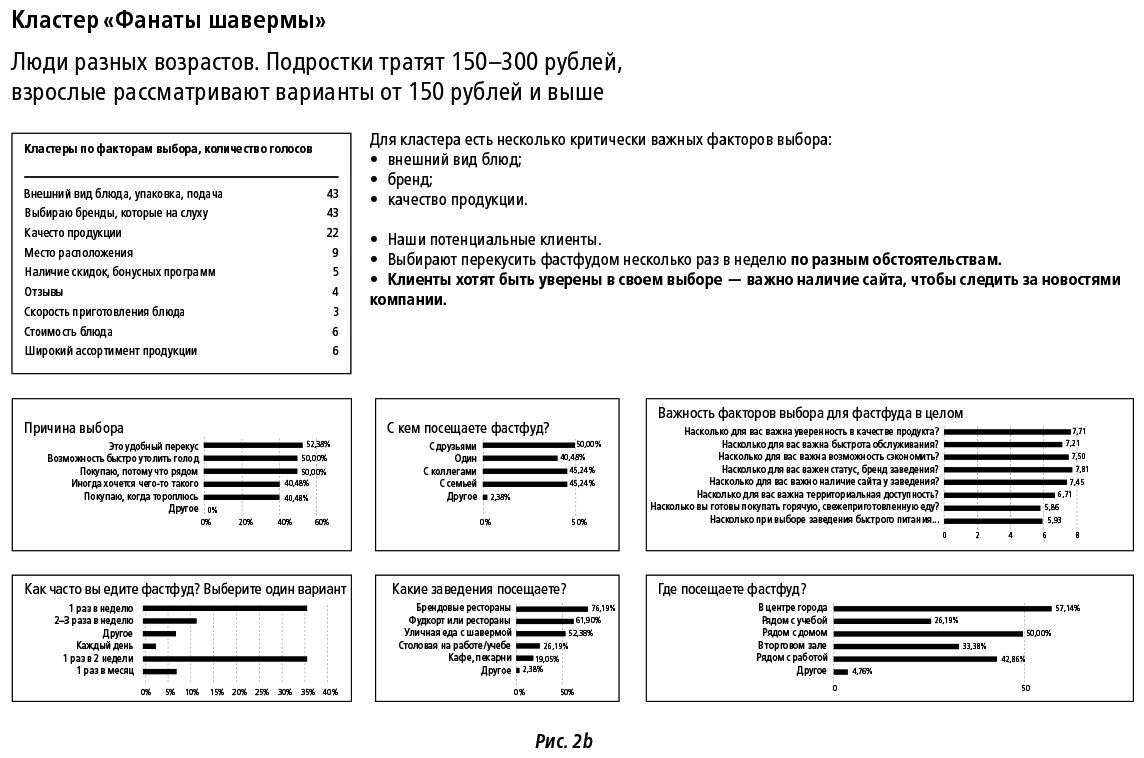 ПРИМЕР № 2Реализуя проект для сети быстрого питания, мы выделили 11 устойчивых JTBD, построенных на оценке регулярности и времени визита, структуры покупок, возрасте клиентов и так далее. На основании данной сегментации каждый чек гостя мог быть соотнесен с одним из 11 сегментов и с конкретной точкой продаж. Учет вклада конкретного JTBD в структуру розничного товарооборота точки, в свою очередь, позволил нам разложить около трех десятков точек сети на шесть групп (например, точки с преобладающими чеками для JTBD «сытный недорогой ужин после учебы»). Этот подход помог клиенту уйти от печати одинаковых POS-материалов и подойти к запуску и поддержке промоакций для каждой точки более осознанно и осмысленно (рис. 2a, b).