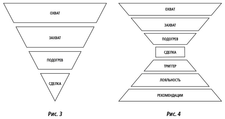 Расширяющееся основание обратной воронки объясняется тем, что если до сделки число желающих купить сокращается от этапа к этапу, то уже купившие постепенно расширяют воронку сделок, создавая для компании все новые и новые источники поступления денег.