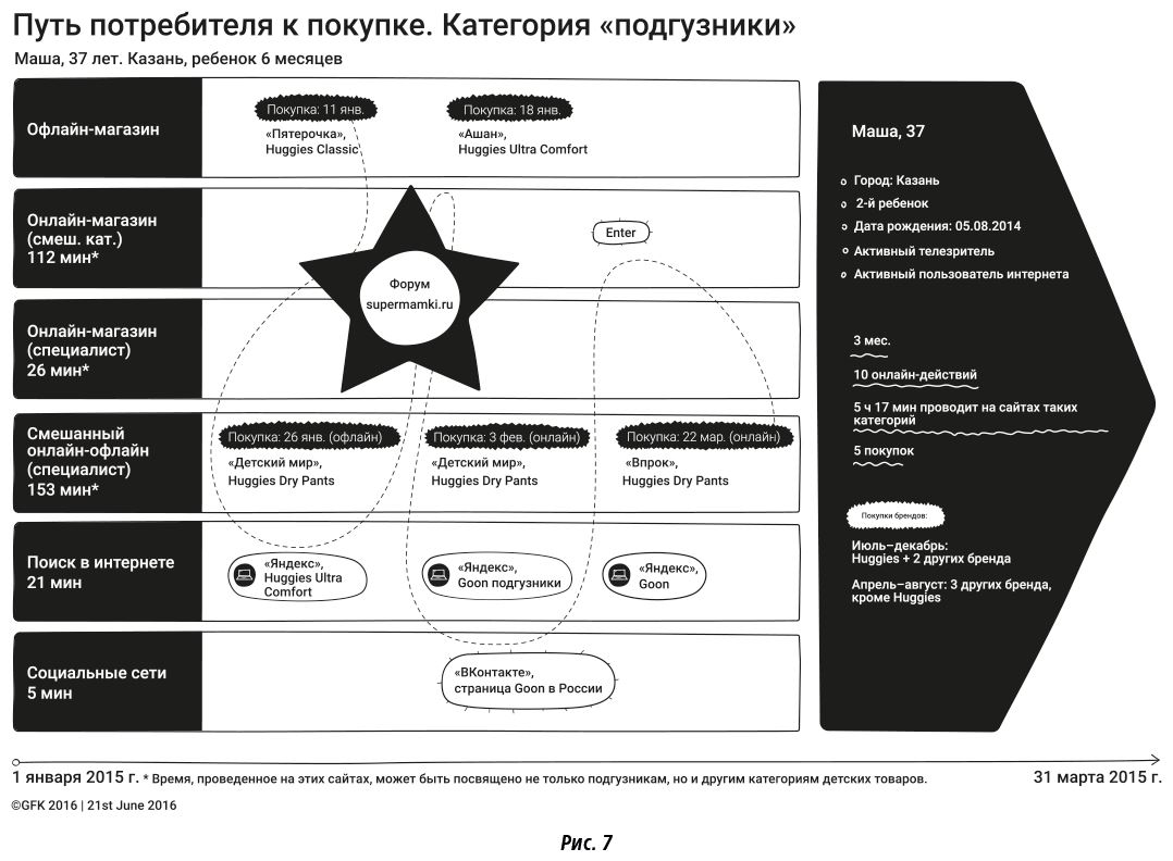 Важно отметить, что в век массового распространения интернета любой клиент имеет возможность оперативно сравнить цены и, более того, охотно этой возможностью пользуется. На рис. 7 представлена составленная GFK-карта типичного путешествия мамы, которая стремится приобрести подгузники для ребенка.