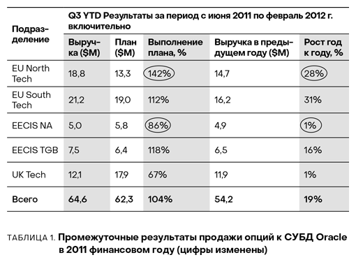 В таблице 1 представлены результаты продаж опций к базам данных Oracle крупнейших департаментов продаж Oracle Direct EMEA за период с июня 2010 по февраль 2011 года включительно.
