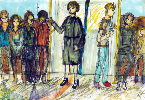 Стоя вместе с парой сотен человек, я достаю из дипломата косметику. К нам подъезжает голубая капсула на триста пассажиров. Забегая внутрь, я быстро начинаю краситься, глядя в стеклянную дверь.