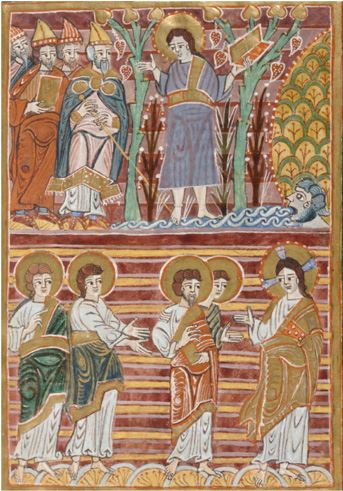 Самое раннее из известных сегодня изображений, на которых иудеи одеты в высокие головные уборы, восходит к началу XI в. Речь идет о рукописи, которую принято называть Вторым Евангелием епископа Бернварда Хильдесхаймского. На одной из миниатюр безбородый Иоанн Креститель проповедует перед группой из четырех бородатых мужчин в треугольных, слегка загнутых назад шапках. Видимо, это религиозные лидеры иудеев – фарисеи и саддукеи (Мф. 3:7), «священники и левиты» (Ин. 1:19) (I.1.6). В другом месте в таких же колпаках изображены двое «начальников» и первосвященник, которые заплатили Иуде Искариоту 30 сребреников за то, что он предаст Христа (Лк. 22:4-5)[47].