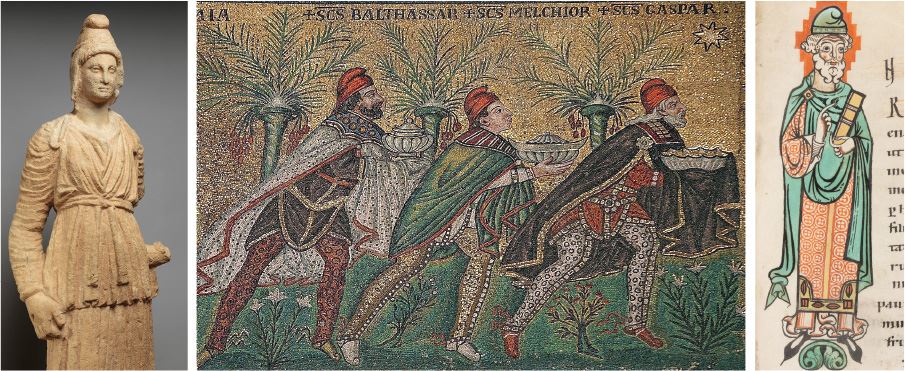 I.1.7. Фригийские колпаки. Слева: Бендида. Кипрская статуя III в. до н. э. (New York. The Metropolitan Museum of Art. № 74.51.2477); в центре – Поклонение волхвов. Мозаика в церкви Сан-Апполинаре-Нуово в Равенне, 561 г.; справа: Пророк Исаия. Инициал из рукописи с комментариями св. Иеронима к Евангелиям от Матфея и Марка.