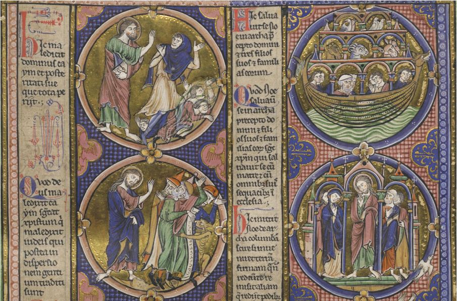 I.1.8. Как сказано в этой Морализованной Библии, проклятие Каина за братоубийство возвещает проклятие иудеев за богоубийство. Потому Каин (слева вверху) и иудеи (слева внизу) изображены в одной позе бегства и поражения: они движутся вперед, в ужасе обернувшись назад – на того, кто их изгоняет. Иудеи, которые держат в руках свиток, одеты в юденхуты двух разных конструкций: твердый высокий и низкий, мягкий, похожий на фригийский колпак.