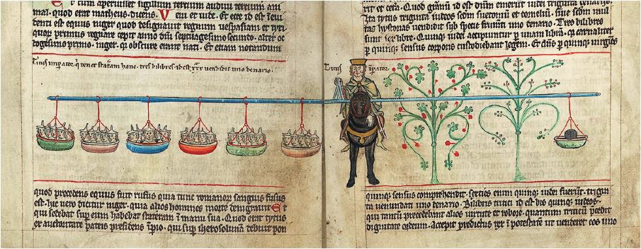Одна из старейших рукописей этого комментария, снабженная множеством иллюстраций, хранится в библиотеке Кембриджского университета[97]. Взглянем на строки «И когда Он снял третью печать, я слышал третье животное, говорящее: иди и смотри. Я взглянул, и вот, конь вороной, и на нем всадник, имеющий меру в руке своей. И слышал я голос посреди четырех животных, говорящий: хиникс пшеницы за динарий, и три хиникса ячменя за динарий; елея же и вина не повреждай» (Откр. 6:5-6) (I.1.19). Александр Бременский отождествлял третьего всадника с римским императором Титом, который в 70 г. н. э. взял Иерусалим и разрушил иудейский храм[98]. На миниатюре мы видим императора, восседающего на черном коне. В его руках – колоссальные весы. Слева – шесть чаш. В каждой из них сидят по пять иудеев в юденхутах, т. е. всего их тридцать. С правой стороны всего одна чаша. В ней лежит динарий с крестом, который уравновешивает их всех (монета похожа на гостию – и это совсем неспроста). Эта сцена, как сказано в комментарии, напоминает о наказании иудеев, которых Тит, завоевав Палестину, стал продавать в рабство по цене в один динарий за 30 человек. Рядом с динарием также изображены виноградная лоза и масличное дерево образы, связанные с Христом.