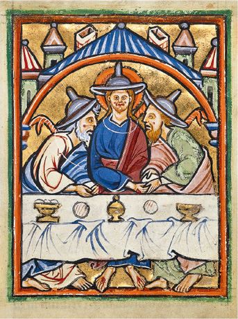 Однако был один сюжет, в котором Христа и двоих апостолов порой одевали в шапки, похожие на еврейские. Речь идет о евангельском эпизоде, известном как встреча в Эммаусе. После того как Христос воскрес, он предстал перед двумя учениками, которые шли в это селение, но они его не узнали. Дело было к вечеру, и ученики позвали его переночевать на том же постоялом дворе, где сами собирались остановиться. «И когда Он возлежал с ними, то, взяв хлеб, благословил, преломил и подал им. Тогда открылись у них глаза, и они узнали Его. Но Он стал невидим для них. И они сказали друг другу: не горело ли в нас сердце наше, когда Он говорил нам на дороге и когда изъяснял нам Писание?» (Лк. 24:30-32).