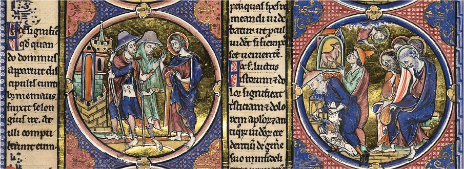 I.1.20. Христос и двое переглядывающихся учеников в широкополых шляпах. В этой рукописи в точно такой же шляпе изображен Иосиф, ведущий Марию с Иисусом в Египет, чтобы спасти их от царя Ирода. Христа чаще всего представляли с крещатым нимбом. Здесь, поскольку он одет в шапку, роль креста выполняют ее поля и верхняя часть, выступающая из тульи.