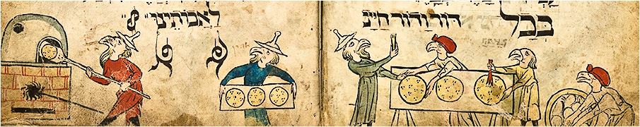 I.1.23. Приготовление мацы для пасхальной трапезы. Все персонажи изображены с птичьими головами. Взрослые мужчины (их можно узнать по бородам) еще и в юденхутах.