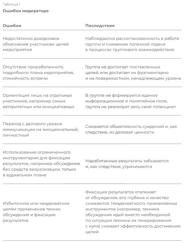Типичные ошибки, которые допускают модераторы, и последствия этого представлены в табл. 1.