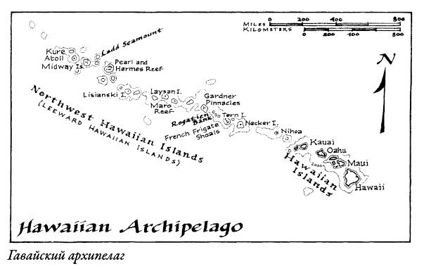 Цепь островов и атоллов под названием Северо-Западные Гавайские острова – часть архипелага, находящаяся далеко даже по местным меркам. Она растянулась больше чем на 1600 километров к западу от того, что обычно принято считать Гавайями. Вся цепь состоит из отдельных точек и мазков в открытом море – скал, атоллов и прочих осколков едва выступающей над поверхностью моря суши, о которых вы, вероятнее всего, никогда не слышали: острова Нихоа и Некер, атолл Френч-Фригат-Шолс, скалы Гарднер, риф Маро, острова Лайсан и Лисянского, риф Перл-энд-Хермес, атолл Мидуэй (единственный, чье название широко известно, потому что здесь произошло решающее морское сражение Второй мировой войны) и атолл Куре. Десять затерянных в океане участков суши от скромного рифа Маро с его единственной возвышающейся над водой вершиной или скал Гарднер площадью 0,024 квадратных километра до атолла Мидуэй, площадь которого составляет 6 квадратных километров. Острова, покоящиеся своим основанием на дне океана и при этом постоянно перемещающиеся благодаря движению тектонических плит, стали крошечными оплотами земной тверди, куда не добрались серфингисты, бикини, пляжные туры, медовые месяцы в июне и тому подобное[6].