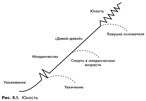 На этапе жизненного цикла, называемом Юностью, компания как бы заново рождается на свет. Переход от этапа Ухаживания к этапу Младенчества подобен физическому рождению. В Юности компания перерождается эмоционально: она начинает получать жизненные силы не только от основателя или от ведущих себя подобно основателю менеджеров. Во многих случаях она напоминает подростка, пытающегося продемонстрировать свою независимость от семьи – любой семьи.