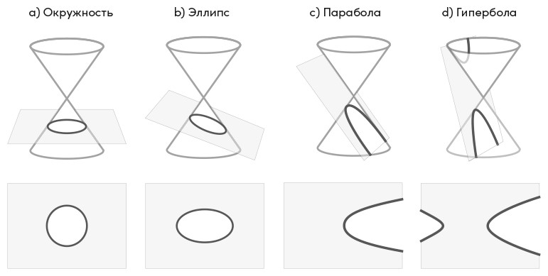 Конические сечения. Орбиты трех типов – эллипс (становящийся окружностью в частном случае), парабола и гипербола – объединены самим фактом того, что они и только они (кроме еще тривиального случая прямой линии) являются траекториями движения тел под действием притяжения одного центра. Они же объединены свойством совершенно иного типа: они и только они (и в специальном случае – прямая) возникают как пересечение плоскости и конуса. Конус – это поверхность, которая образуется, если свернуть в воронку лист бумаги, но с одним уточнением: математический конус продолжается по обе стороны от вершины, как видно уже на рис. 1.7a. Если теперь пересечь конус плоскостью, которая перпендикулярна оси симметрии, то в сечении получится окружность. Наклоняя плоскость, мы получаем в сечении разнообразные эллипсы – всё более вытянутые по мере того, как наклон плоскости увеличивается (рис. 1.7b), – до тех пор, пока наклон не станет таким же, как наклон образующей конуса. В этом случае (рис. 1.7c) в сечении получается парабола (в некотором роде, как мы говорили, эллипсов много, а парабола одна; здесь эта идея выражается в том, что парабола возникает при точно обозначенном угле). Наклоняя плоскость еще сильнее, получаем в сечении гиперболы – разные в зависимости от угла наклона (рис. 1.7d). Здесь требуется небольшое пояснение: каждая гипербола имеет две части, потому что плоскость задевает и верхнюю, и нижнюю половины конуса. Говоря о гиперболе как о траектории движения, имеют в виду одну ее половину (которую тогда тоже называют гиперболой).