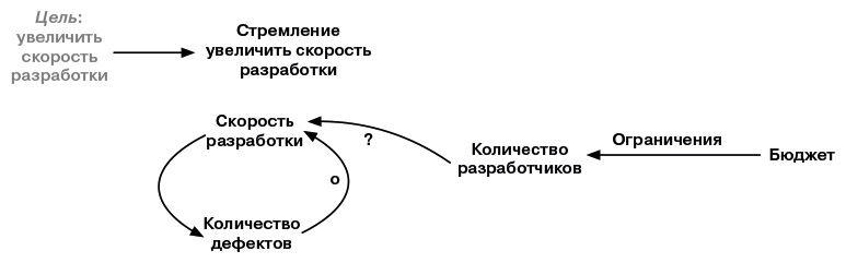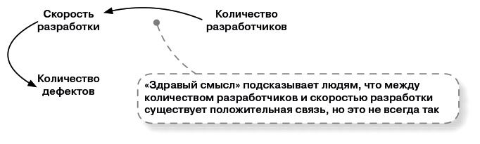 Уже на этом этапе можно столкнуться с законом Вайнберга‒Брукса и ловушкой причинно-следственной связи. Нарисовать схему легко; совсем другое дело – построить ее с правильным пониманием. Например, рассмотрим взаимосвязь между количеством разработчиков и скоростью разработки.