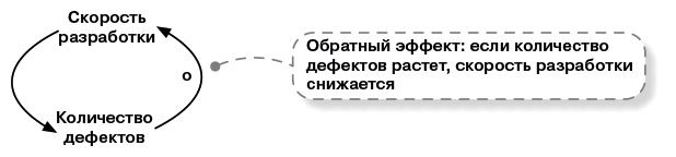 Обратные эффекты. Эффект причинно-следственной связи может быть не только прямым, но и обратным: например, рост A ведет к росту Б, и наоборот. Обратный эффект обозначен на диаграмме символом «О» рядом с линией. Допустим, что увеличение количества дефектов создает препятствия для дальнейшей разработки, что, как следствие, замедляет скорость поставки новой функциональности, потому что люди тратят больше времени на исправление ошибок или поиск обходных путей.
