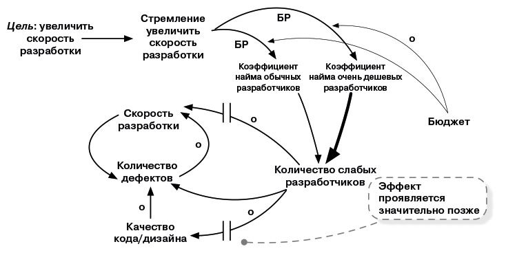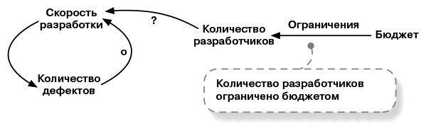 Эффекты взаимодействия. Бюджет ограничивает наем новых сотрудников. Одно из трудных и медленных решений – найти способы увеличить бюджет. Быстрое и простое решение – нанять намного более дешевых разработчиков. В этом случае бюджет оказывает эффект взаимодействия, влияя на другие причинно-следственные связи. Когда принимается решение нанять дополнительных разработчиков, недостаточный бюджет вынуждает вас нанимать наиболее дешевых.