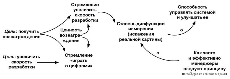 Цель, подкрепленная вознаграждением, побуждает людей не только действовать, но и создавать видимость действий и достижений посредством дисфункции измерения, которая порождается предложенной системой вознаграждения. И дисфункция измерения может быть прямо пропорциональна воспринимаемой ценности вознаграждения, потому что люди мотивированы получить вознаграждение, а не улучшить систему [Austin96]. Давайте посмотрим, как вознаграждение может привести к снижению производительности системы. Системная динамика может выглядеть так: