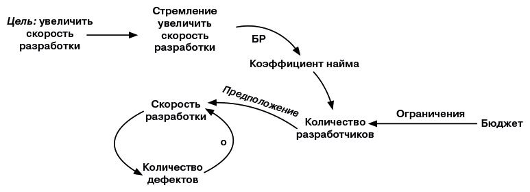 «Быстрые решения». Одно из трудных и медленных решений для увеличения скорости разработки – улучшить человеческий ресурс: нанять сильных разработчиков, расширить обучение и коучинг имеющейся команды, уволить слабых сотрудников. Альтернатива – достичь цели быстро и с наименьшими усилиями за счет «быстрого решения» или так называемого квик-фикса (quick fix). Иногда быстрое решение работает как в краткосрочной, так и в долгосрочной перспективе и действительно улучшает систему. Но иногда это не удается, и тогда получается как в поговорке: «Быстрее – значит медленнее». Например, если стоит цель увеличить скорость поставки новой функциональности, первое, что обычно приходит в голову людям, – увеличить количество разработчиков. Согласно их предположению, это самый быстрый и простой способ решить проблему со скоростью разработки. Итак, добавим в нашу схему это «быстрое решение» (символ БР):