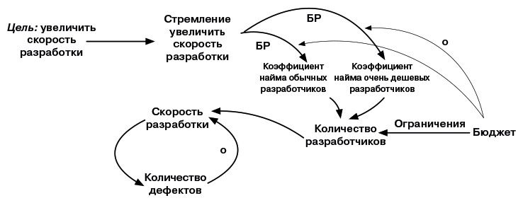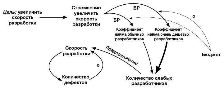 Просто провести (обратную) причинно-следственную связь напрямую от бюджета к коэффициенту найма очень дешевых разработчиков не совсем правильно, так как, по сути, это будет означать, что уменьшение бюджета ведет к увеличению найма очень дешевых разработчиков. Мы же хотим показать эффект взаимодействия – а именно то, что причинно-следственная связь A влияет на причинно-следственную связь Б. Чтобы графически показать это, мы проводим линию обратной причинно-следственной связи от бюджета к линии быстрого решения (БР), которая в результате раздваивается на коэффициент найма обычных и очень дешевых разработчиков: