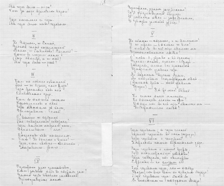 Когда она написана?Цветаева пишет «Поэму Горы» в январе 1924 года, подводя символическую черту под романом с Константином Родзевичем. В это время она живёт с мужем[139] и дочерью[140] в Праге (Эфрон получает студенческую стипендию, Цветаева, как русский поэт, – вспомоществование от чешского правительства плюс гонорары от еженедельника «Воля России»). Сюжет будущего произведения она, по сути, проговаривает в январском письме другому своему увлечению Александру Бахраху[141], сообщая, что рассталась с Родзевичем «любя и любимая, в полный разгар любви… Разбив его и свою жизнь», Цветаева формулирует: «Ничего не хочу, кроме него, а его никогда не будет. Это такое первое расставание за жизнь, потому что, любя, захотел всего: жизни: простой совместной жизни, то, о чём никогда не "догадывался" никто из меня любивших. – Будь моей. – И моё: – увы!»[142] Пишет Цветаева «Поэму Горы» быстро, буквально на одном дыхании. Только закончив послесловие, тут же приступает к её сюжетному продолжению – «Поэме Конца». Работа над вторым текстом, напротив, растягивается: пять месяцев и 140 страниц черновиков, за это время Цветаева не написала ни одного стихотворения.
