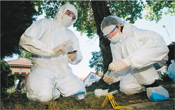 ● Взрывчатые вещества и их следы. Следы горения на месте взрыва могут содержать остаточные частицы конкретных взрывчатых или химических веществ. Исследование следов не до конца сгоревшего пороха на руках стрелка и вокруг огнестрельных ранений может указать на конкретный образец оружия или изобличить подозреваемого.